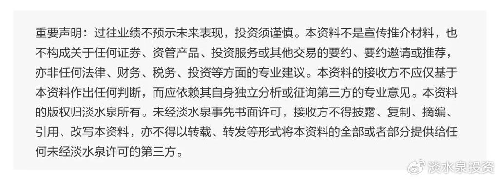 重要提示:本材料不构成淡水泉任何形式的要约、承诺或其他法律文件,亦非任何投资、法律或财务等方面的专业建议。过往业绩不预示未来表现。投资须谨慎。