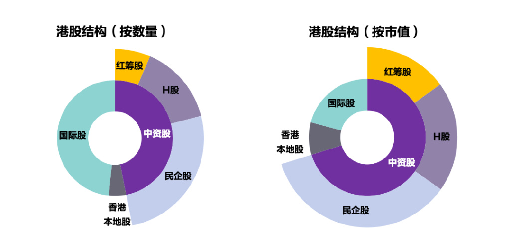 中资股:超过1200家,约占港股上市公司总数的47%,市值占比约70%,包括红筹股、H股、民企股。
