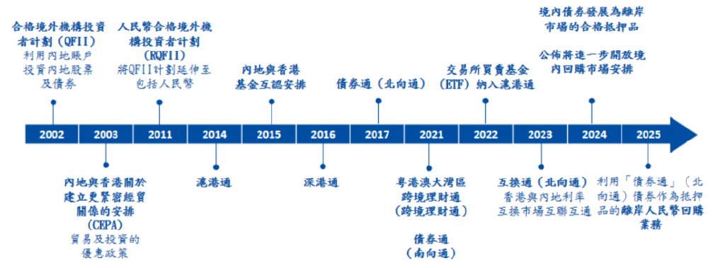 香港凭借其背靠内地的独有优势,是通往内地的桥梁,也是全球最大的离岸人民币业务中心。这些连接渠道方便海外投资者参与中国市场发展带来的机遇。
