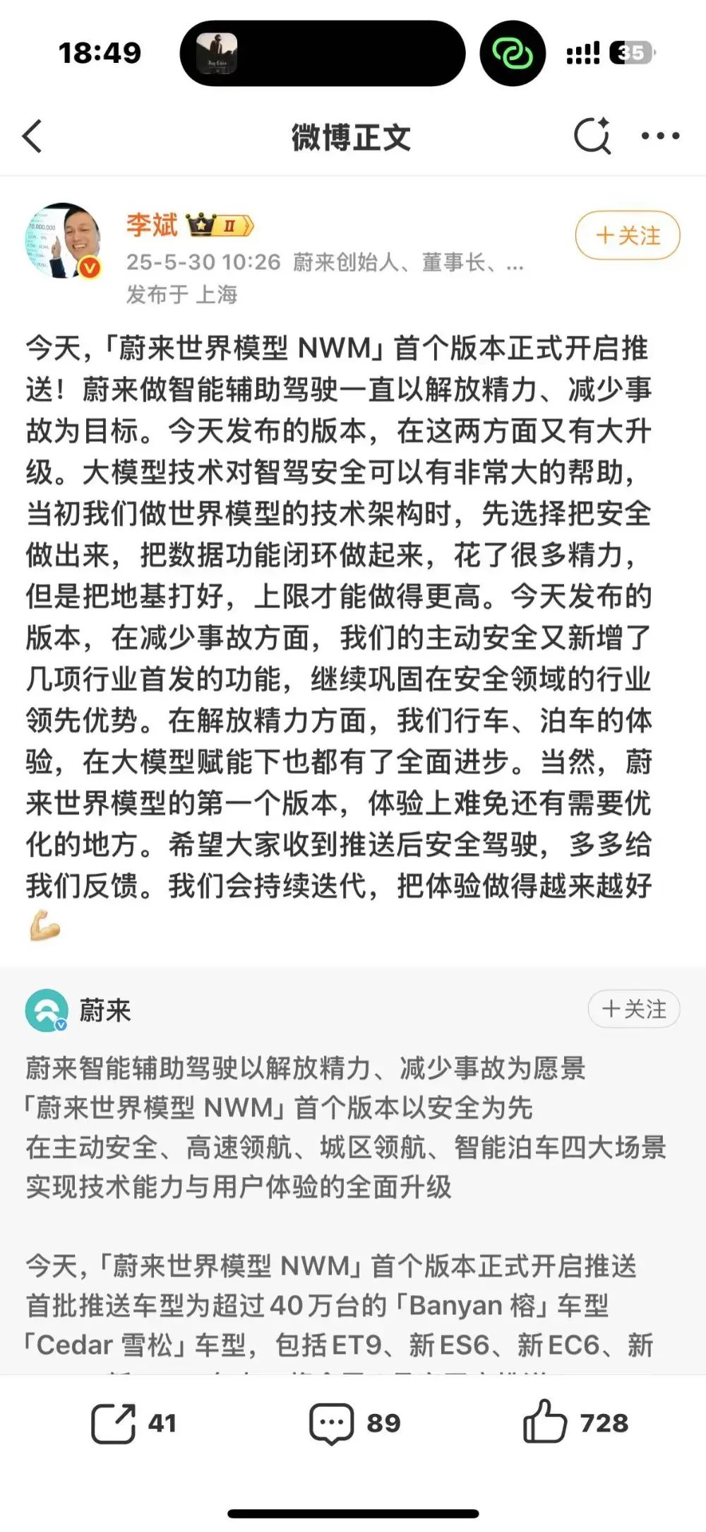 就在前两日,蔚来创始人李斌在微博开启了直播。