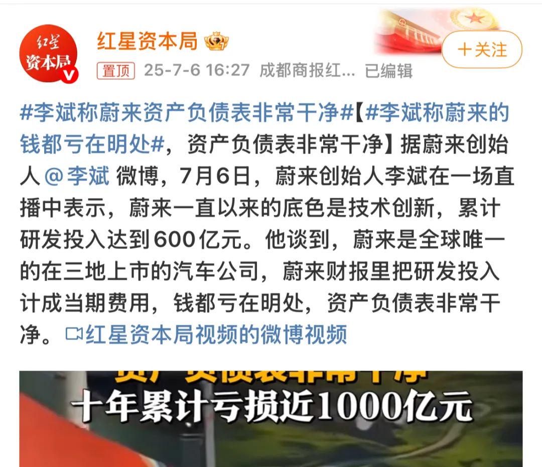 “蔚来是全球唯一的在三地上市的汽车公司,蔚来财报里把研发投入计成当期费用,钱都亏在明处,资产负债表非常干净。”