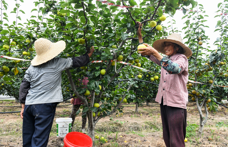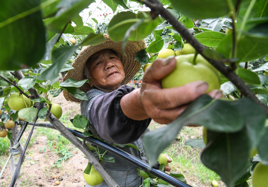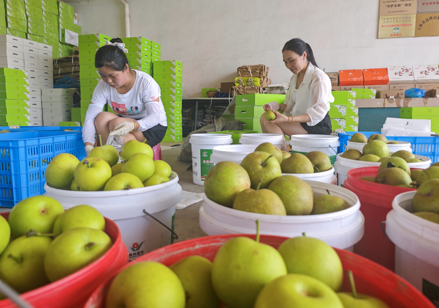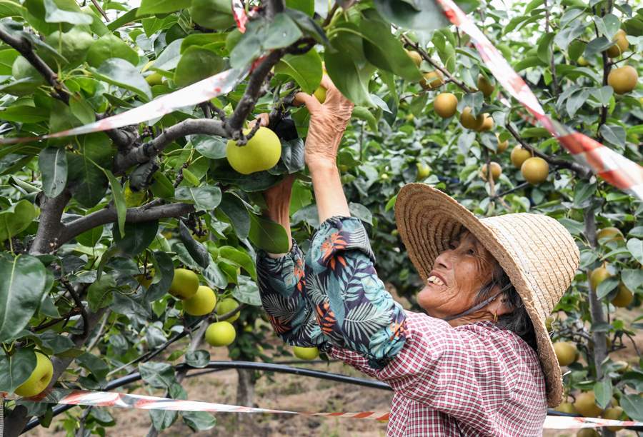 7月16日下午,在梨园里,果农冒着酷暑上阳网,忙着采摘新鲜的蜜梨。这些蜜梨集中打包后将通过物流发往各地,让更多人品尝到夏日当季美味。