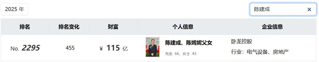 陈建成及女儿陈嫣妮,为公司实控人,持有38.84%股权。据《2025胡润全球富豪榜》,父女俩拥有115亿财富。