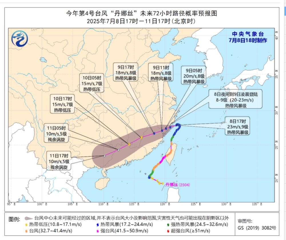 根据气象部门预计,“丹娜丝”将以每小时5-10公里的速度向西偏南方向移动,强度维持,并在浙江温州至福建宁德一带沿海登陆,登陆后转向西偏南方向移动,强度缓慢减弱。