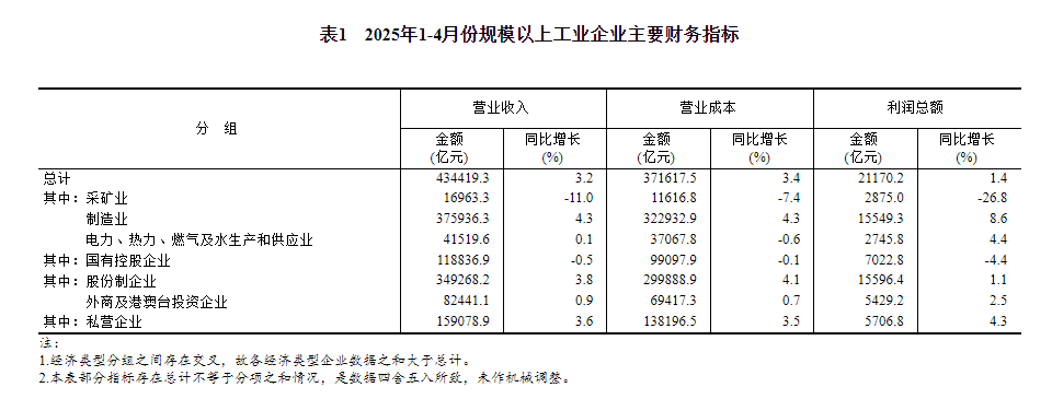1—4月份,规模以上工业企业中,国有控股企业实现利润总额7022.8亿元,同比下降4.4%;股份制企业实现利润总额15596.4亿元,增长1.1%;外商及港澳台投资企业实现利润总额5429.2亿元,增长2.5%;私营企业实现利润总额5706.8亿元,增长4.3%。