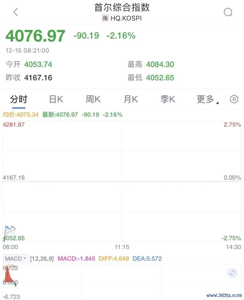 12月15日上午,日韩股市大幅走低,首尔综合指数一度大跌2.75%,随后震荡拉升。