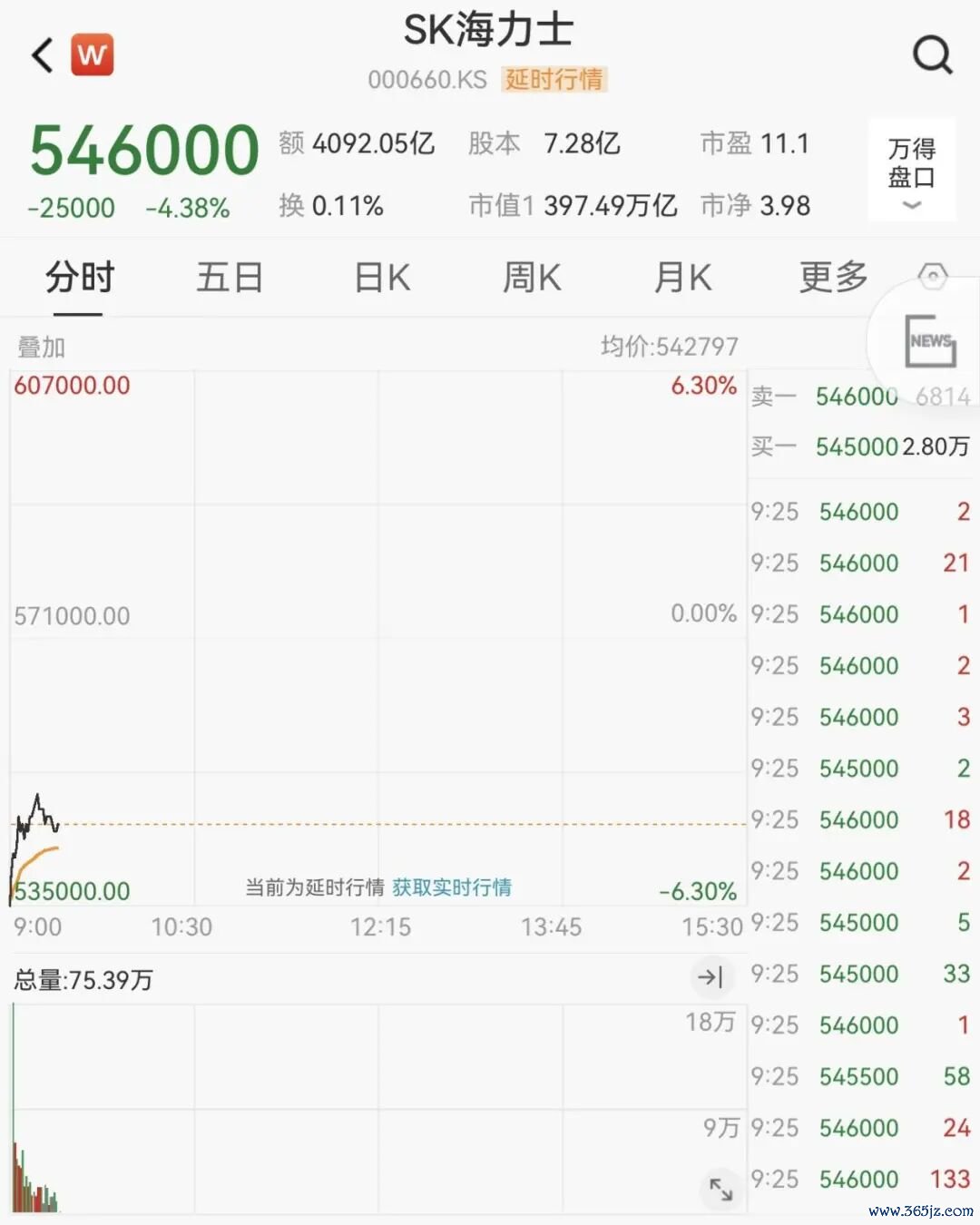 个股方面,SK海力士领跌韩国芯片股,追随华尔街上周五跌势。SK海力士股价下跌4.38%,至54.6万韩元,三星电子、现代建设、斗山集团等跌幅居前。