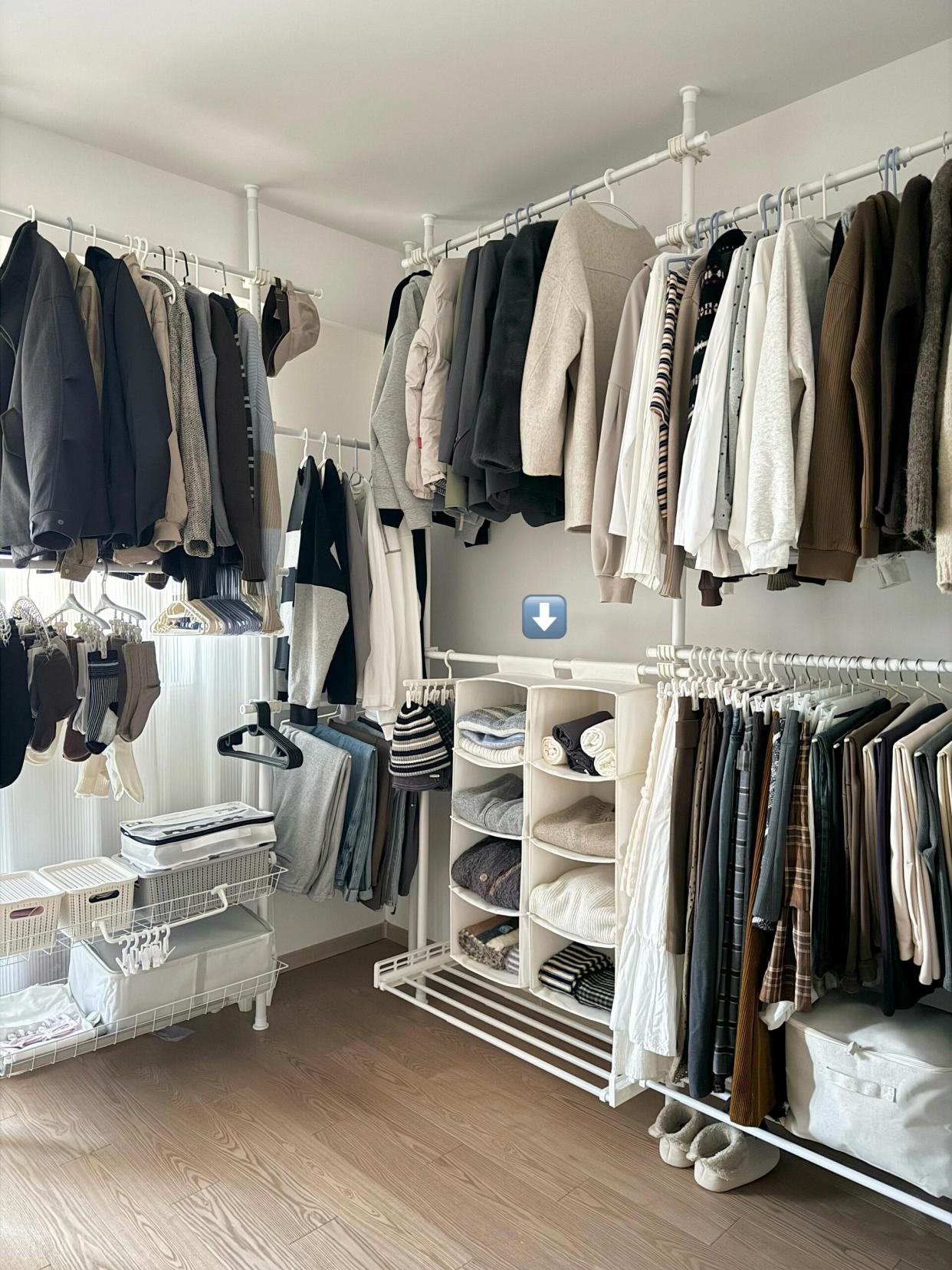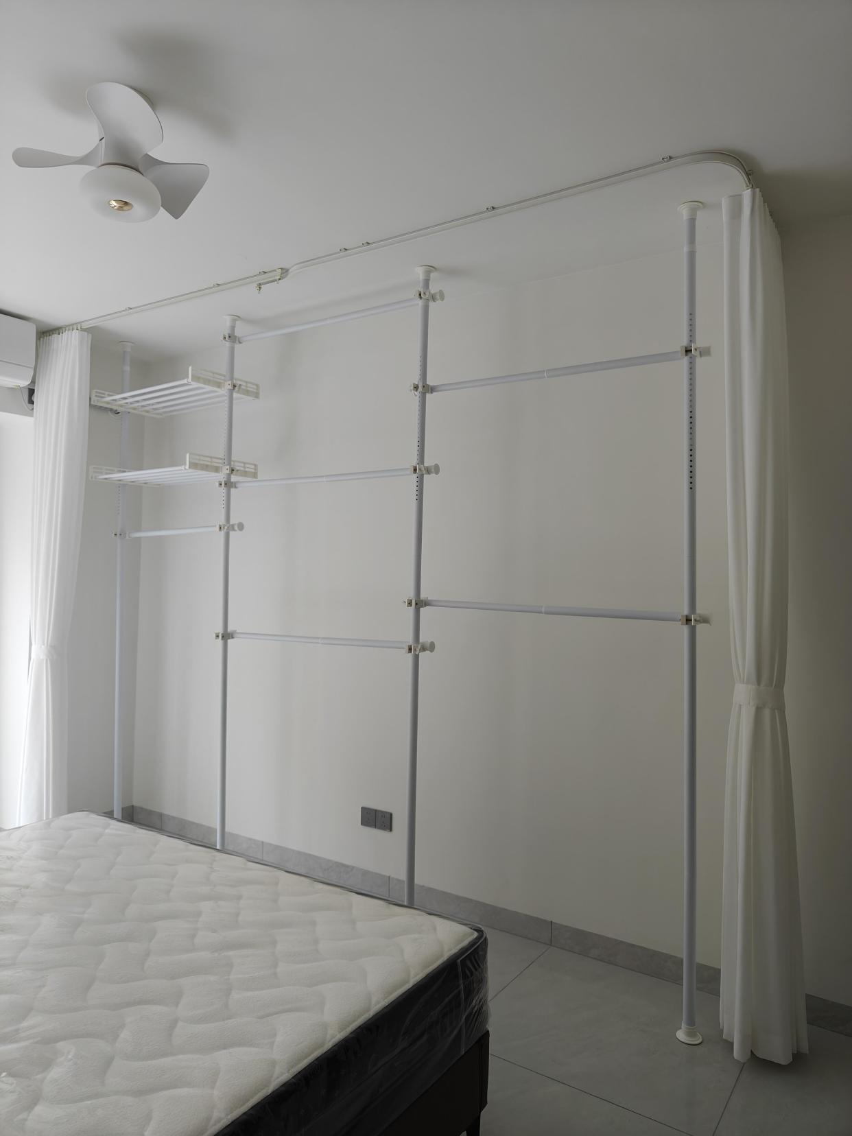 租房时不想花大价钱买衣柜的,就用天地杆,可以挂很多衣服,甚至还可以加收纳篮用来放小件。