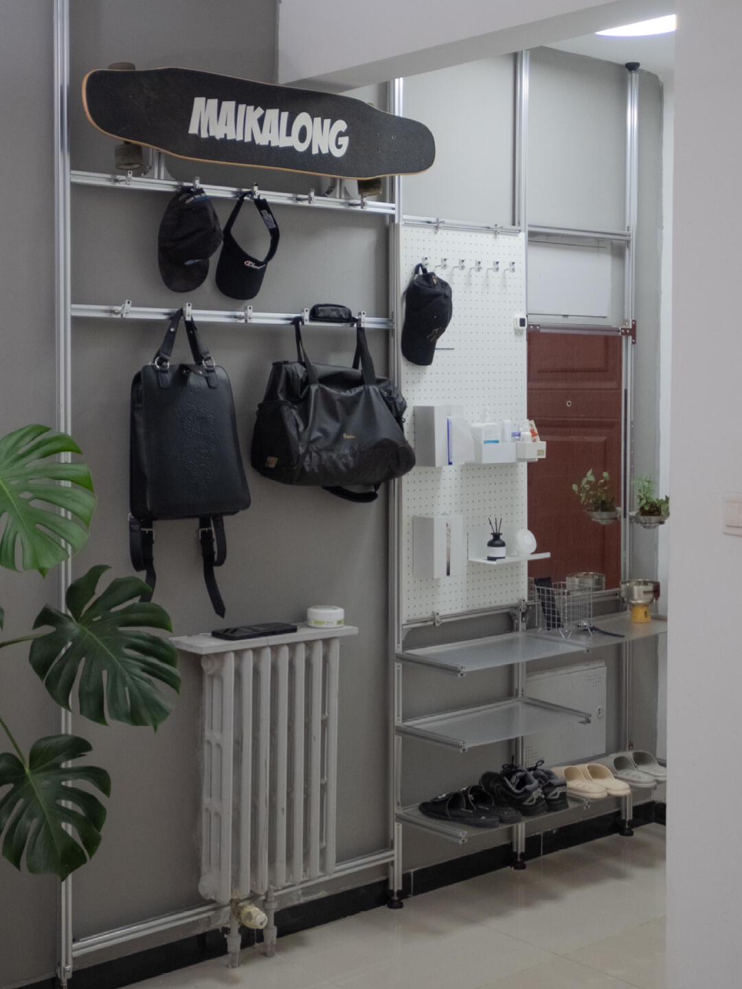 网友@凉拌海哲 用铝型材的天地杆加洞洞板做了一个玄关收纳区。