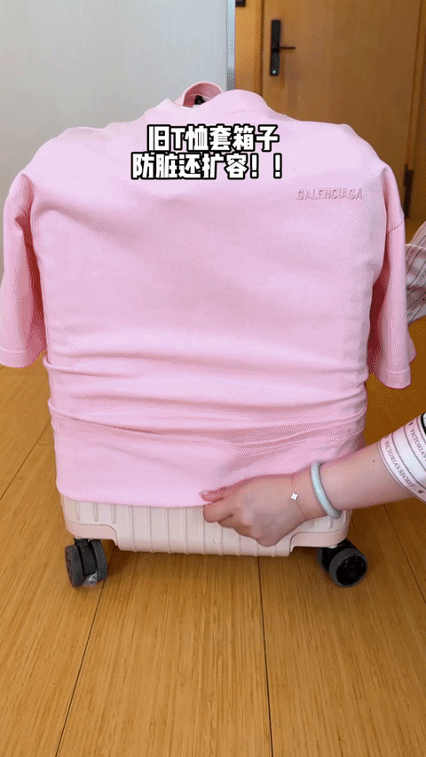 更妙的是,行李箱怕弄脏或刮蹭到,可以直接在上面套一件旧T恤。