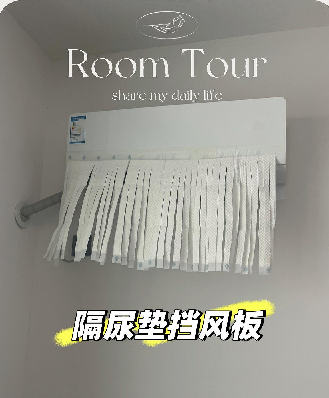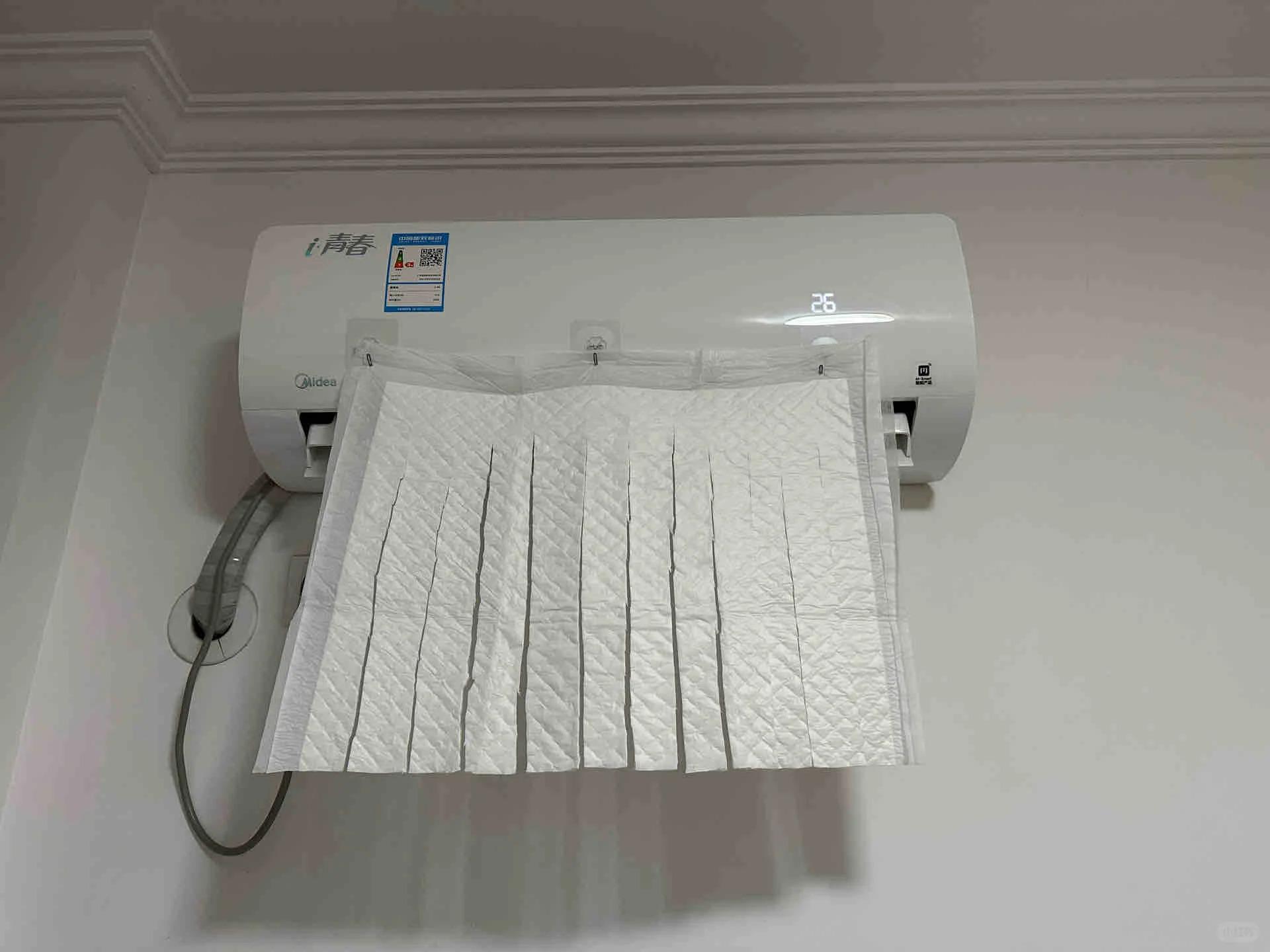 然后,网友就用孩子没用完的大号隔尿垫,用剪刀随便剪几刀,做了一个挡风,粘贴在空调上,这个!非常好用!夏天开冷气还吸空调湿气。