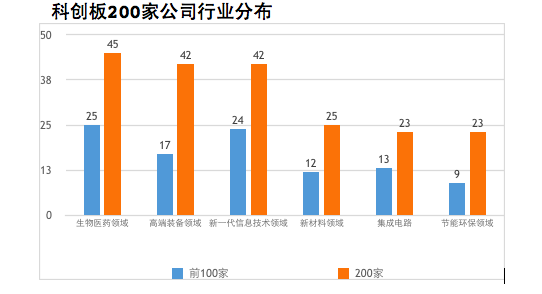 从200家上市公司所处的行业看来,高度集中在高新技术产业和战略新兴产业。其中,新一代信息技术(包括集成电路)和生物医药领域合计占比达55%,分别为65家、45家,高端装备、新材料和节能环保各有42家、25家和23家。