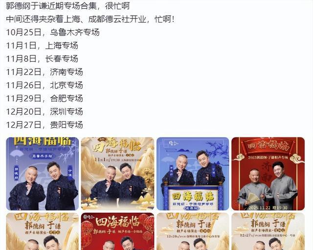 11月份,郭德纲将在上海、长春、济南、北京、合肥这五座城市举办相声专场。除了相声专场,郭德纲在上海、吉林还会带来京剧《济公活佛》第七本。在相声、京剧演出的空档期,郭德纲、于谦、侯震、曹鹤阳、杨九郎、张九龄、王九龙等还会在武汉、苏州带来话剧《窝头会馆》。可以说,郭德纲的11月份,档期满满的,很充实。