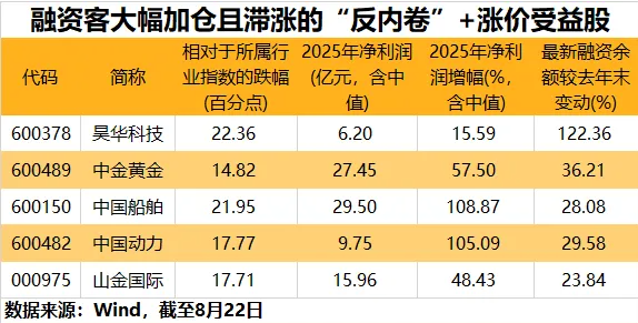 结合行业来看,“反内卷”+涨价受益股中,截至8月22日,年内跑输所属的申万行业,且最新融资余额较去年末加仓幅度超过20%的个股仅有5只,按照加仓幅度排序,分别为昊华科技、中金黄金、中国船舶、中国动力、山金国际,其中昊华科技获融资客加仓超过120%。